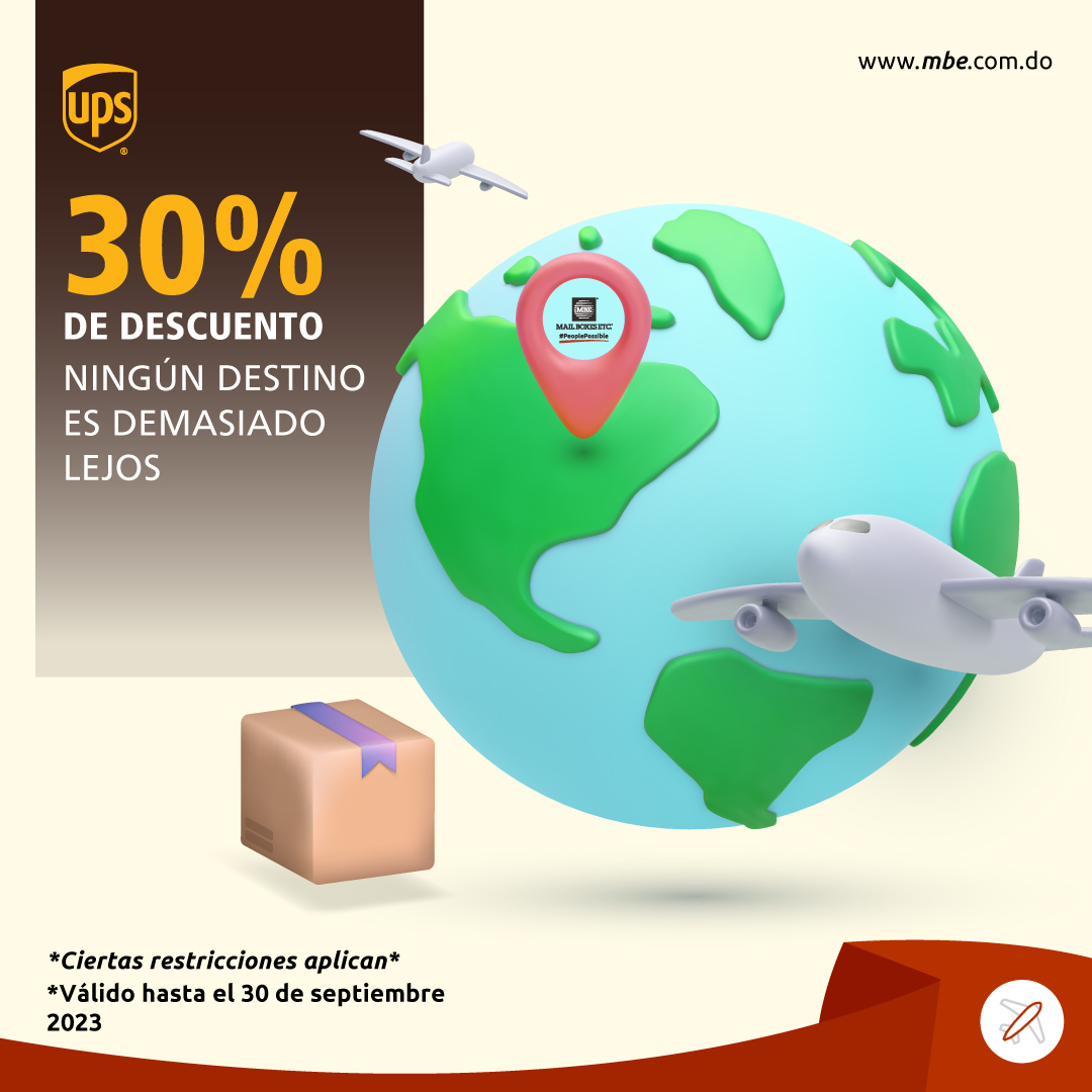 En Mail Boxes Etc. Republica Dominicana, seguimos ofreciendole a nuestros clientes las mejores soluciones para el envío internacionales, es por esto, que en conjunto con UPS tenemos un 30% de descuento a disfrutar hasta el 30 de Septiembre del 2023 al enviar sus documentos y paquetes. Dicha tarifa promocional aplica para los siguientes países: