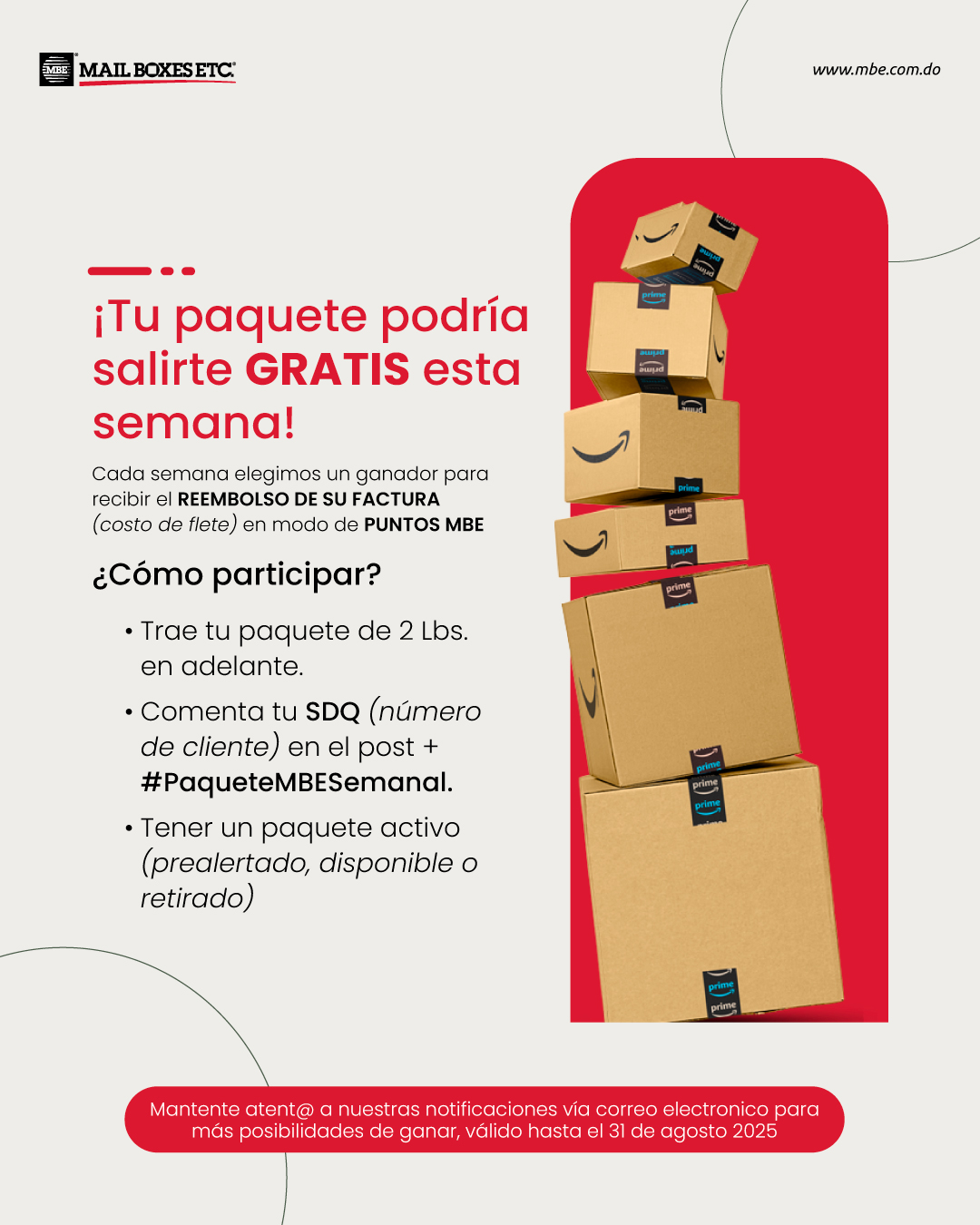 ¡Participa cada semana y dale valor a tus envíos! Tu paquete puede ser el #PaqueteMBESemanal ganador. ¿Estás listo para enviar y ganar con MBE?